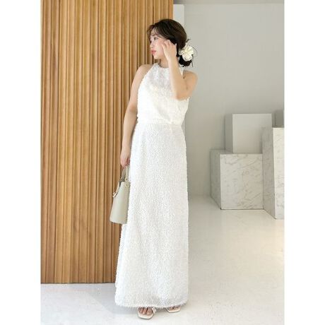 流れるような動きを表現したカットジャガードと大胆なバックオープンデザインで、華やかさを効かせたドレス。