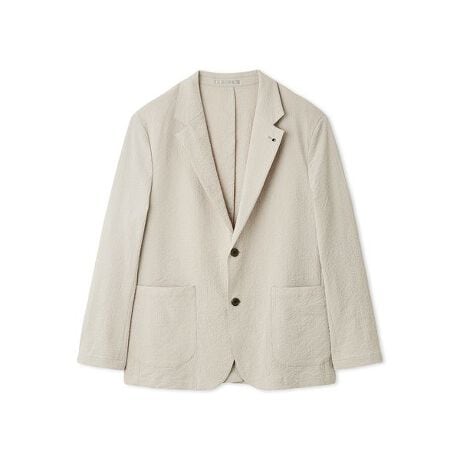袖口の筒仕様や四つボタンフロント、パッチポケットなど、随所にドレスダウンの要素を取り入れることで、構築的でありながら軽やかに羽織れる仕上がりに。