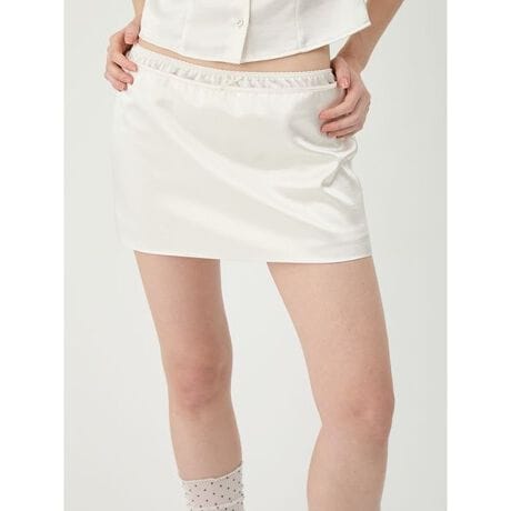 </b>程よい光沢感が上品なサテン素材を使用したミニスカショートパンツ。ウエストをゴム仕様にし、あえて腰履きのような低めの位置で着こなす新しいバランス感の一枚に仕上げました。ミニスカートの可愛らしさと、ショートパンツの安心感を両立したデザインが魅力です。<b>