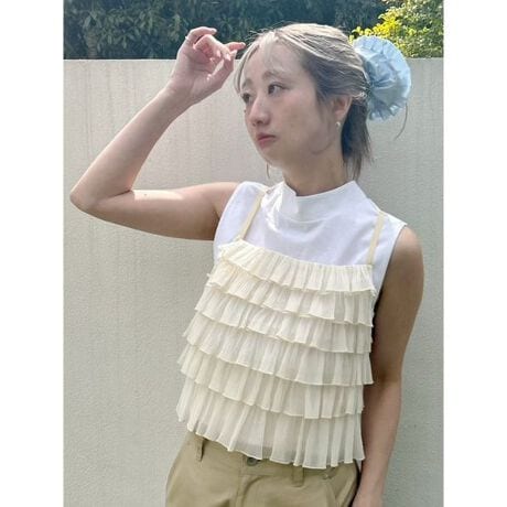 ボリュームたっぷりのフリルをあしらったビスチェと、着回しやすいベーシックなカットソートップスを組み合わせたセットアイテム。ビスチェのバックスタイルにはゴムを入れ、肩紐はアジャスターで調整可能にすることで、身体に心地よくフィットするストレスフリーな着心地を実現しました。セットでの着用はもちろん、それぞれ単品でも活躍し、お手持ちのアイテムと合わせることでコーディネートの幅がぐっと広がります。<b>