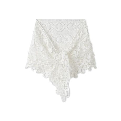 フラワーモチーフとハシゴレースを三角形に編み立てたクラフト感のあるスカーフ。