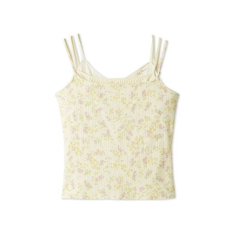 </b>レイヤードデザインのキャミソールと、シンプルなキャミソールの2枚がセットになった着回し力抜群のアイテム。ボディラインに優しくフィットする柔らかなカットソー素材を使用し、大きく開いた襟ぐりがデコルテを美しく引き立てます。小花を散らした繊細なオリジナルプリントがフェミニンなムードを演出。ランジェリーライクな胸元のラインには、さりげなくブランド刺繍を施し、愛らしいアクセントを添えました。<b>
