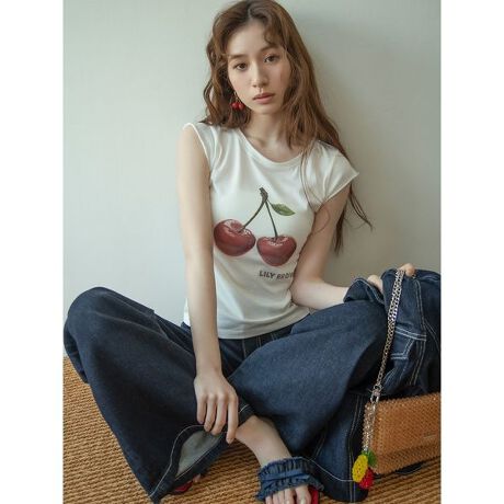 </b>フロントに大きく施したフルーツプリントが目を引く「LILY BROWN」らしいミニTシャツ。プリントの上にはビジューをあしらい、果実の瑞々しい質感をキラキラとした輝きで表現しました。トレンド感のあるコンパクトなシルエットながら、首元は鎖骨を美しく見せる広めのラインに設定。縁に施したピコテープがさりげないアクセントになり、カジュアルなTシャツスタイルに大人の可愛らしさと抜け感を添えてくれる一枚です。<b>