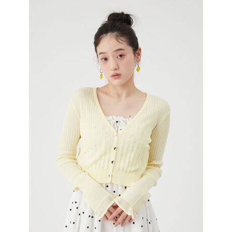 </b>夏の日差し対策にも重宝する、肌離れの良いさらっとした質感が魅力のカーディガン。短すぎない絶妙なショート丈に設定し、ワンピース(品番:LWNO262109)とのセットアップはもちろん、単品でパンツと合わせてもバランス良く決まる万能な一枚です。身頃には異なるピッチのリブを組み合わせ、シンプルながらも表情豊かな仕上がりに。袖口はほんのり広がるフレアラインに透け感をプラスし、手元に抜け感と女性らしさを添える小技を利かせました。<b>