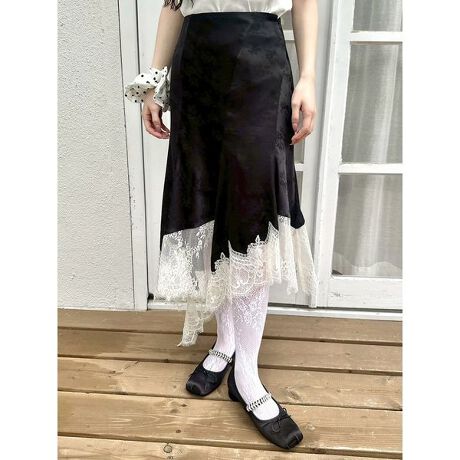 <b>【ヴィンテージの美学を纏う、レース剥ぎ合わせのサテンイレギュラーヘムスカート】</b><b>