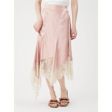 <b>【ヴィンテージの美学を纏う、レース剥ぎ合わせのサテンイレギュラーヘムスカート】</b><b>