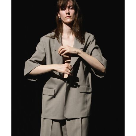 低めに設定したフロントの位置や、左胸の千鳥ステッチ、サイドベンツなど、シンプルなシルエットの中にこだわりディティールを散りばめたジャケット。