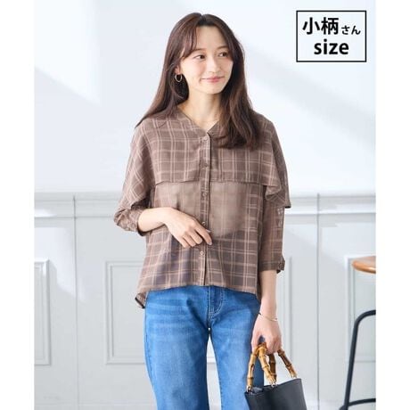 涼しげな印象のシアー素材のブラウスは、汎用性の高いネイビー無地と、鮮度あるブラウン系チェック柄の2色展開です。