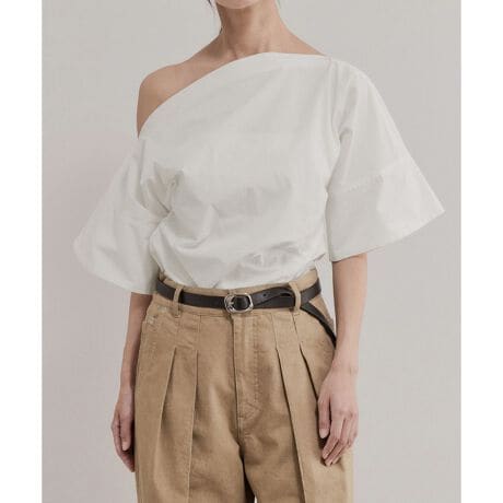 右肩を落として着用するようにデザインしたアシンメトリーなトップス。