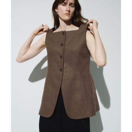 ジレのような前開きのデザインでありながら、ノースリーブのトップス感覚で着用できるデザイントップス。