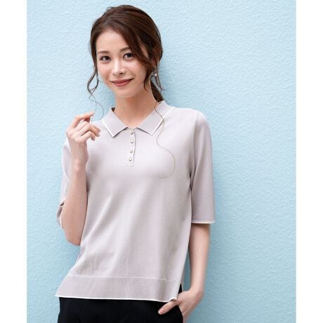 ・襟と袖口の配色がポイントのポロニット・ゴールドのボタンで上品さをプラス・裾にスリットを入れることで、スカートにもパンツにも合わせやすいデザイン・サラッとした天竺編みで、夏も快適に着られる質感