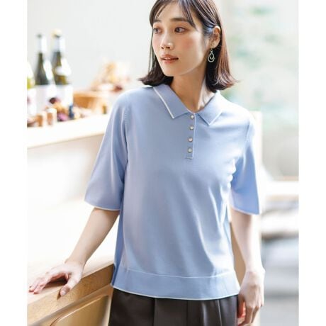 ・襟と袖口の配色がポイントのポロニット・ゴールドのボタンで上品さをプラス・裾にスリットを入れることで、スカートにもパンツにも合わせやすいデザイン・サラッとした天竺編みで、夏も快適に着られる質感