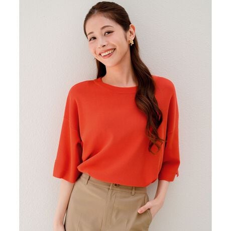 ・さりげない襟の編み柄と、鎖骨をきれいに見せるネックライン・二の腕をカバーする長めの半袖と、スリット入りで華奢見えが叶うデザイン・袖口のゴールドボタンがさりげないアクセントに・ボーダーを含む、カラフルな色展開も魅力・総針編みで、しっかりとした上品な見え感