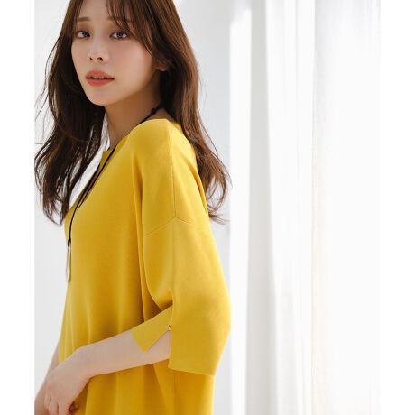 ・さりげない襟の編み柄と、鎖骨をきれいに見せるネックライン・二の腕をカバーする長めの半袖と、スリット入りで華奢見えが叶うデザイン・袖口のゴールドボタンがさりげないアクセントに・ボーダーを含む、カラフルな色展開も魅力・総針編みで、しっかりとした上品な見え感