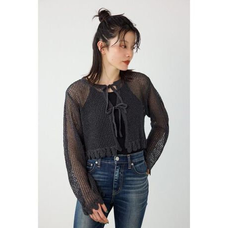 ■ポイントリボンがかわいらしく、アクセントになるメッシュ柄ボレロ。気温が安定しづらい時期に、1枚あると便利なアイテムです。■ディテールゆるっとしたラフなシルエット。ショート丈でスタイルアップを叶えてくれます。■スタイリング程よい透け感でヘルシーな肌見せが出来るので、インナーにキャミソールやタンクトップを合わせるのがおすすめです。ワンピースなど丈の長いアイテムと合わせると、さらにスタイルアップ効果が期待できます。■生地麻タッチの糸を使用し、ドライな風合いに仕上げた素材です。細かなメッシュ編みにすることで清涼感をプラス。エッジング仕様とリボンデザインで、レディライクな印象に仕上げています。■透け感:あり■裏 地:なし■伸縮性:あり■光沢感:ややあり※お取り扱い上のご注意メッシュ編みのニット素材のため、ハンガー掛けの際に襟元などが伸びる可能性があります。サイズ変化の原因となる場合がありますので、こまめにハンガーから外すなどご注意ください。また、引っ掛かりやすい編地のため、お取り扱いには十分ご注意ください。[注意事項]※画像の商品はサンプルです。実際の商品と仕様、加工が若干異なる場合があります。※画像の商品は光の照射や角度、お使いのモニター環境により、実物と色味が異なる場合がございます。※着用、お取り扱いの際は、アテンションタグをご確認ください。