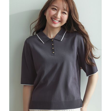 ・襟と袖口の配色がポイントのポロニット・ゴールドのボタンで上品さをプラス・裾にスリットを入れることで、スカートにもパンツにも合わせやすいデザイン・サラッとした天竺編みで、夏も快適に着られる質感