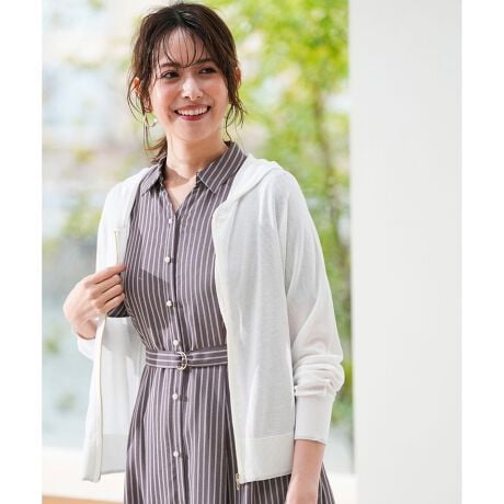 ・ドルマンデザインでゆったりとしたシルエットのニットパーカー・袖口端と裾口にさりげないラメがアクセント・透けすぎないシアー感と長袖仕様で冷房対策にも最適・袖ぐりがゆったりしており、インナーを選ばず着用可能