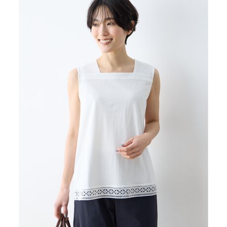 [型番:491261]一枚にもレイヤードにも。夏の着こなしを涼しく快適に夏のお出かけに嬉しい、UVカット&接触冷感機能付きのタンクトップ。首元のスクエアネックが品良く着映え、デコルテラインを美しく魅せます。左裾は刺しゅうでさりげないアクセントを、裾回りにレースをあしらい大人可愛さを添えました。1枚でもトップスと合わせてレイヤードスタイルでも華やかな印象を楽しめるアイテムです。