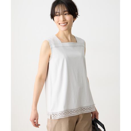 [型番:491261]一枚にもレイヤードにも。夏の着こなしを涼しく快適に夏のお出かけに嬉しい、UVカット&接触冷感機能付きのタンクトップ。首元のスクエアネックが品良く着映え、デコルテラインを美しく魅せます。左裾は刺しゅうでさりげないアクセントを、裾回りにレースをあしらい大人可愛さを添えました。1枚でもトップスと合わせてレイヤードスタイルでも華やかな印象を楽しめるアイテムです。