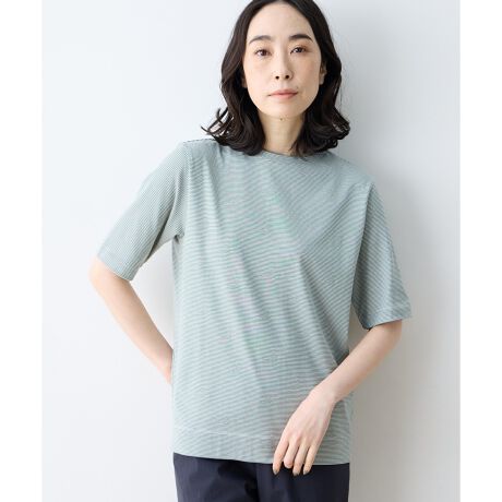 [型番:491263]幅広く着こなす、大人ボーダー柄 繊細なボーダー柄で大人上品に仕上げたTシャツ。綿100%の柔らかな素材は肌触りも良く、心地良い快適さが続きます。バランス良く配置した月の刺しゅうが、さりげないアクセントに。シンプルなデザインでスカートにもパンツにも合わせやすく、幅広いシーンで活躍します。