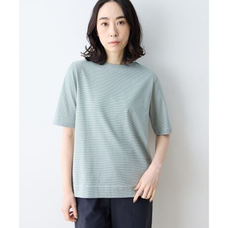 [型番:491263]幅広く着こなす、大人ボーダー柄 繊細なボーダー柄で大人上品に仕上げたTシャツ。綿100%の柔らかな素材は肌触りも良く、心地良い快適さが続きます。バランス良く配置した月の刺しゅうが、さりげないアクセントに。シンプルなデザインでスカートにもパンツにも合わせやすく、幅広いシーンで活躍します。