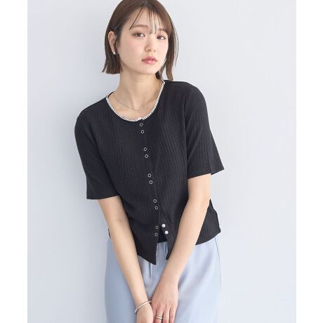 繊細なラメのきらめきと、リブ素材のすっきりとしたシルエットが魅力のカットソーです。ほどよいフィット感で着心地がよく、体のラインをきれいに見せてくれます。さりげないチェーン風のディテールとプチフリルがアクセントになり、大人可愛い雰囲気を演出します。スナップボタン付きで着脱しやすく、実用性とデザイン性を兼ね備えているのもポイントです。パンツにもスカートにも合わせやすく、コーディネートに華やかさを添えてくれる万能なアイテムです。