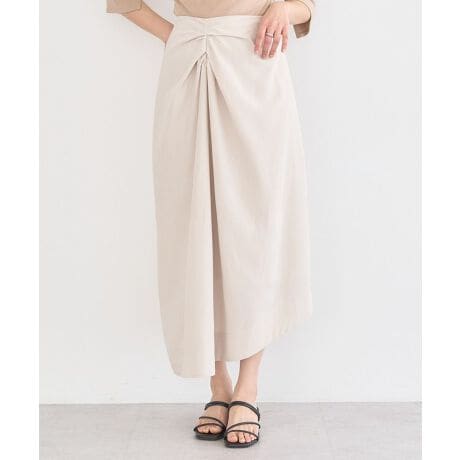 ウエストのツイストデザインが印象的で、シンプルながらも華やかさを引き立てるスカートです。アシンメトリーなシルエットとサイドにかけて長くなるヘムラインが、動きのある軽やかな印象を演出します。Aラインのシルエットは体のラインを自然にカバーしつつ、女性らしいやわらかさを引き出してくれるのが魅力です。トップスをインすることでウエストデザインが際立ち、スタイルアップ効果も期待できます。きれいめにもカジュアルにも合わせやすく、日常のコーディネートに取り入れやすい一着です。