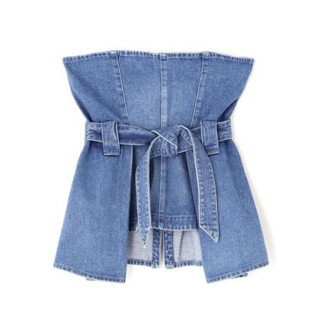 デニム素材のビスチェ。ヘムのフリルとウエストベルトをアレンジして遊び心のある着こなしに。