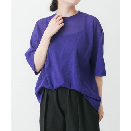 綿をベースにポリエステルを混紡、軽くてサラッとした清涼感のある素材を使用。綿の柔らかさにポリエステルのハリ感が加わってシワになりにくいのが特徴です。程良いシアー感のある天竺編みで通気性も良く肌離れしやすい快適な着用感になっています。インナーとのレイヤードスタイルが楽しめるシンプルデザインになっており、いろいろなコーディネートで活躍します。