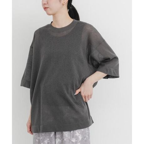 綿をベースにポリエステルを混紡、軽くてサラッとした清涼感のある素材を使用。綿の柔らかさにポリエステルのハリ感が加わってシワになりにくいのが特徴です。程良いシアー感のある天竺編みで通気性も良く肌離れしやすい快適な着用感になっています。インナーとのレイヤードスタイルが楽しめるシンプルデザインになっており、いろいろなコーディネートで活躍します。