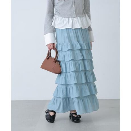 トレンド感のあるティアードロングスカート。軽やかな素材とウエストゴム仕様で、快適なはき心地です。裾に向かって程よく広がるナローシルエットで、すっきりとした印象に。動くたびに揺れるミニフリルが華やかさをプラス。ルーズからコンパクト、クロップド丈まで幅広いトップスと合わせやすいデザインです。無地3色(縦ワッシャー素材)とドット柄1色を揃えています。※モデルの着用画像の場合、光の当たり具合により、実際の色味と異なって見えることがございます。色味は、商品単体の画像をご参照ください。