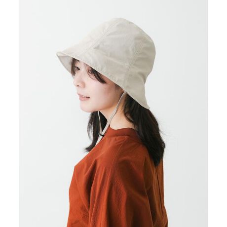 撥水・UV機能があり、ドライタッチな質感で清涼感のあるナイロンタッサー素材を使用。バケットハットにチューリップハットデザインを取り入れて女性らしく仕上げました。後ろに刻みを入れることで、髪の毛を後ろで束ねた時に被りやすくしました。前が上げやすくなっていますので変化をつけて楽しめます。