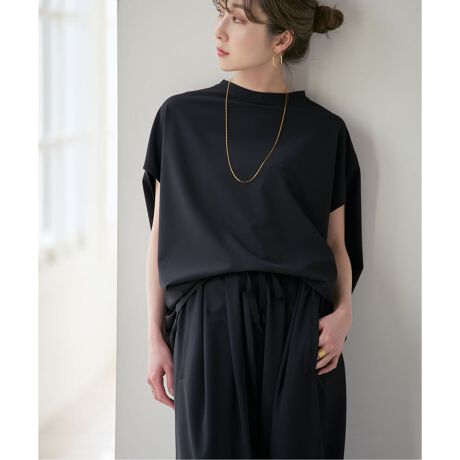 程よい反発と膨らみのあるタッチで肌に張り付きにくく、涼やかな着心地が続くのが特徴。さらにUVカット、撥水加工、接触冷感、透け防止、ツーウェイストレッチと、春から夏まで嬉しい機能が備わった優秀素材。