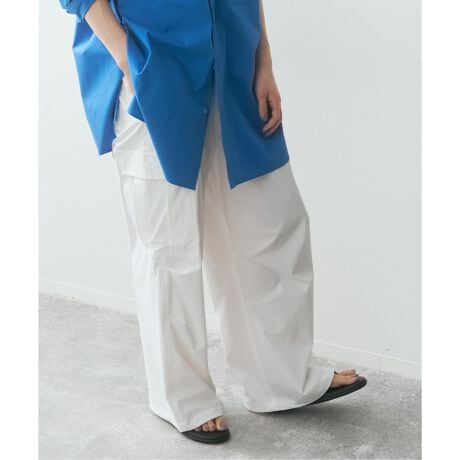 風通しの良い素材で、暑い季節も快適に過ごせます。シワになりにくく、デイリーに活躍する一本です。程よいボリューム感がスタイリングのアクセントになります。