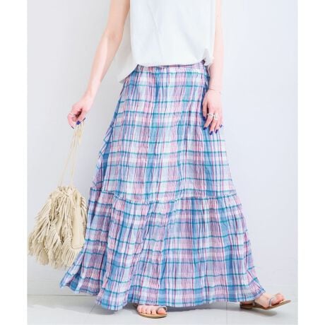 カラフルな配色使いが特徴的で、加工によりややくすんだナチュラルな風合いのインド綿を使用した先染めチェックスカートです。1段ティアード切り替えにし、自然と裾に向かって広がるシルエットになります。しわも気になりにくく、カジュアルな雰囲気のある夏におすすめのスカートです。