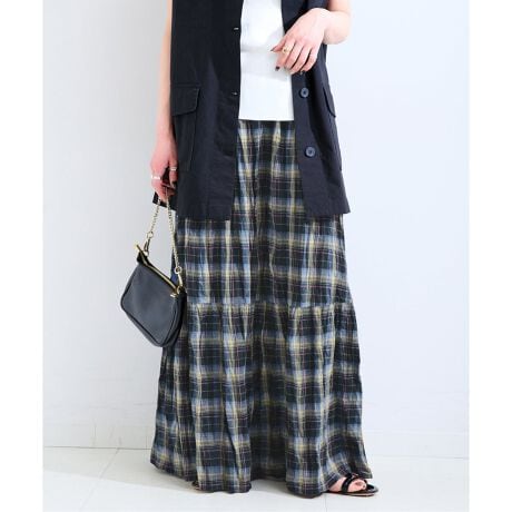 カラフルな配色使いが特徴的で、加工によりややくすんだナチュラルな風合いのインド綿を使用した先染めチェックスカートです。1段ティアード切り替えにし、自然と裾に向かって広がるシルエットになります。しわも気になりにくく、カジュアルな雰囲気のある夏におすすめのスカートです。