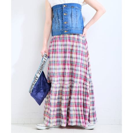 カラフルな配色使いが特徴的で、加工によりややくすんだナチュラルな風合いのインド綿を使用した先染めチェックスカートです。1段ティアード切り替えにし、自然と裾に向かって広がるシルエットになります。しわも気になりにくく、カジュアルな雰囲気のある夏におすすめのスカートです。