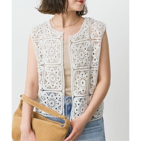 繊細なかぎ針編み風モチーフが目を惹く、上品なクロッシェベスト。