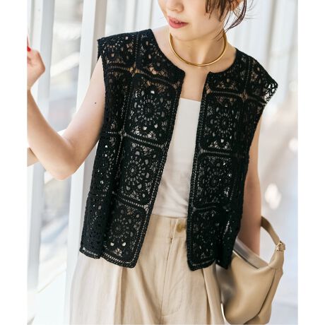 繊細なかぎ針編み風モチーフが目を惹く、上品なクロッシェベスト。