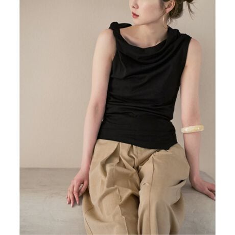 サイドにあしらわれた結び目とギャザーが、美しいドレープと立体的なシルエットを演出するデザインカットソー。