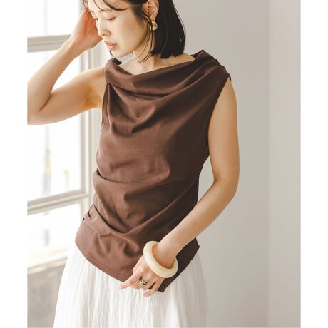 サイドにあしらわれた結び目とギャザーが、美しいドレープと立体的なシルエットを演出するデザインカットソー。