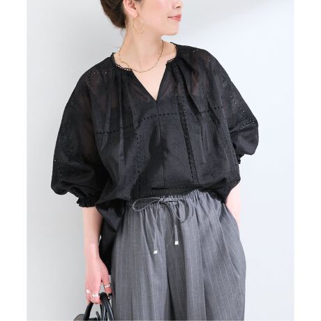 シアーオーガンジーにハンカチーフのような刺繍を入れたブラウス。