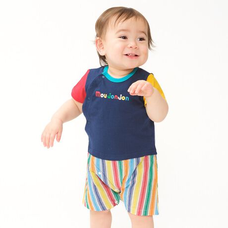 ポコポコと凹凸感のある夏らしいサッカー素材のストライプをパンツ部分に。トップスは天竺、Tシャツ素材。異素材切替のロンパース、Tオール。カラフルなロゴのプリントもポイント!同じデザインのTシャツ(M36805)、ハーフパンツ(M35103)があるので、兄弟でお揃い、ペアコーデ、リンクコーデもおすすめ!おそろいアイテムはギフトやプレゼントにも人気です!【アイテム】プレゼント ギフト 赤ちゃん服 ベビー服 贈り物 トップス ボトムス つなぎ カジュアル お洒落 オシャレ かわいい 可愛い 普段着 デイリーウェア お出かけ着 ロンパース Tオール 子ども こども 男児 男の子 ボーイズ キッズ ベビーサイズ 幼稚園 保育園通園 2026年春夏物新作 丸高衣料 ホワイト 白色 ネイビー 紺色 ムージョンジョン コットン100% 綿100%