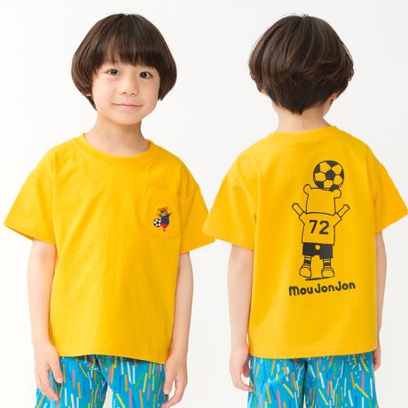 胸ポケットにはサッカーをしているくまの刺繍入り。バックプリントにはヘディングしているクマ。ストーリー性のあるグラフィック使いの半袖Tシャツ。【アイテム】トップス カジュアル お洒落 オシャレ かっこいい かわいい 可愛い 普段着 デイリーウェア お出かけ着 お外着 お外遊び着 子ども服 こども服 男児 男の子 ボーイズ キッズ ベビーサイズ トドラーサイズ 幼稚園 保育園 小学校 通園 通学 小学生 2026年春夏物新作 丸高衣料 イエロー 黄色 ブルー 青色 スポーツ 熊 動物 アニマル ムージョンジョン コットン100% 綿100%
