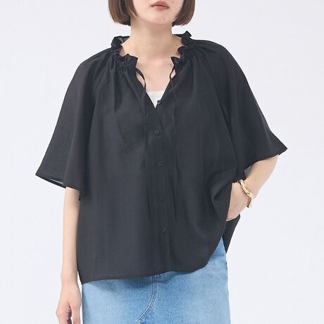 首元のフリルとギャザーが、お顔回りを華やかに彩るブラウス。