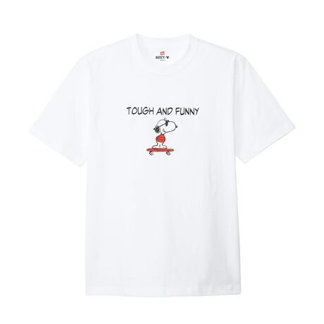 1975年に誕生したロングセラー、BEEFY-T?(ビーフィーT)初のアートプリント企画。プリンタブルボディとして誕生したBEEFY-T?に、コミックやキャラクターとして世界で愛され続ける「PEANUTS(ピーナッツ)」に登場する世界一有名な犬ともいえるキャラクター、スヌーピーを採用。BEEFY?のコンセプト「タフであること」が込められた「TOUGH AND FUNNY」の印象的なメッセージと、元気よくスケートボードを乗りこなすスヌーピーの変装姿のひとつ、クールな大学生に扮したJOE COOL(ジョー・クール)を胸元にデザイン。このアートはBEEFY-T?だけのオリジナルで、名前を入れたTシャツとスケートデッキの赤はHanes?(ヘインズ)のブランドカラー。ボディはBEEFY-T?で最も人気のHM1-D001クルーネックTシャツ。ヘビーウェイト(肉厚)のコットン100生地を使用。洗えば洗うほど肌に馴染む風合いや、洗いこんでも首周りの伸びや型くずれが起きにくい強さと耐久性が特長です。アメリカンテイストを感じさせるクラシックなボックスシルエット。脇に縫い目のない丸胴編みに加え、首元にネームデザインをプリントするタグレス仕様で襟ネームの肌当たりを解消し、快適な着心地です。