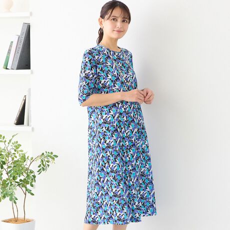 色が効いたモダンな幾何調の花柄でコーディネートがぱっと華やぎます。