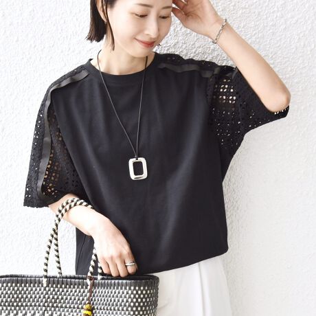 《予約》【WEB限定】〈手洗い可能〉レース コンビ ショート スリーブ カットソー