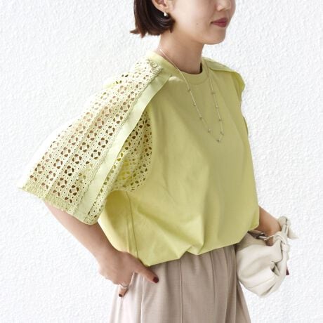 袖のレースコンビが素敵なトップス。