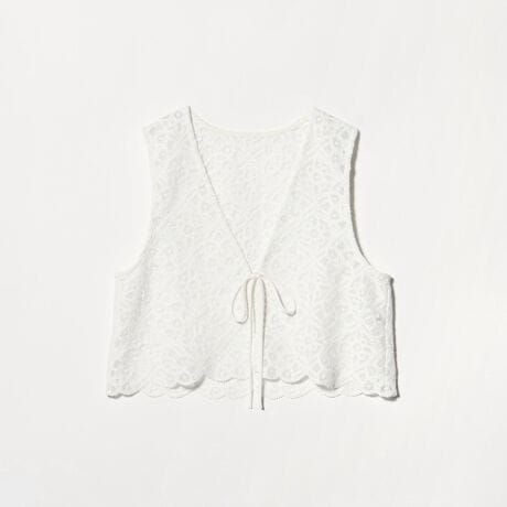 レースの透けが涼しげなベストは、重ね着のしにくい暑い時季にも重宝するアイテムです。